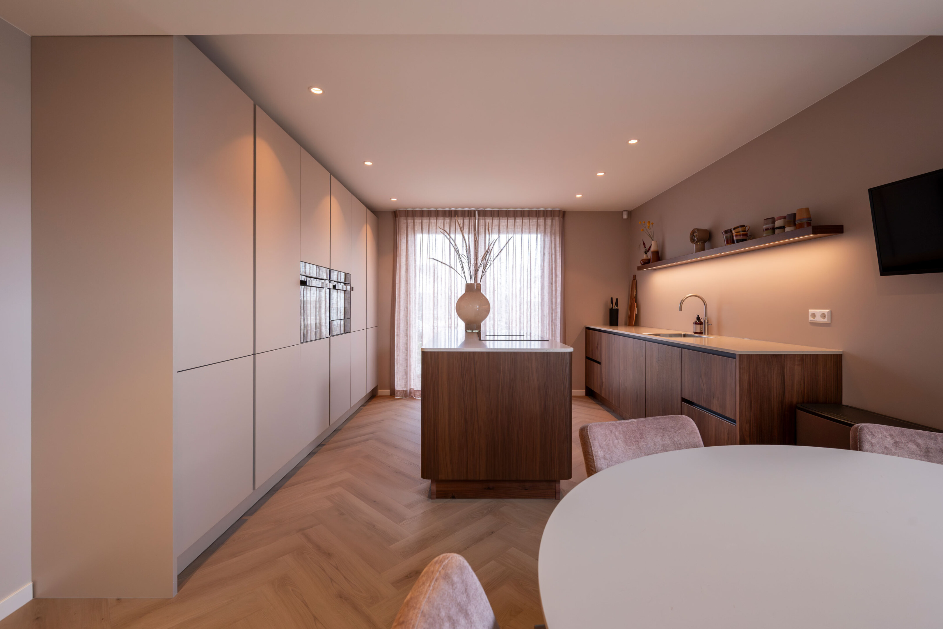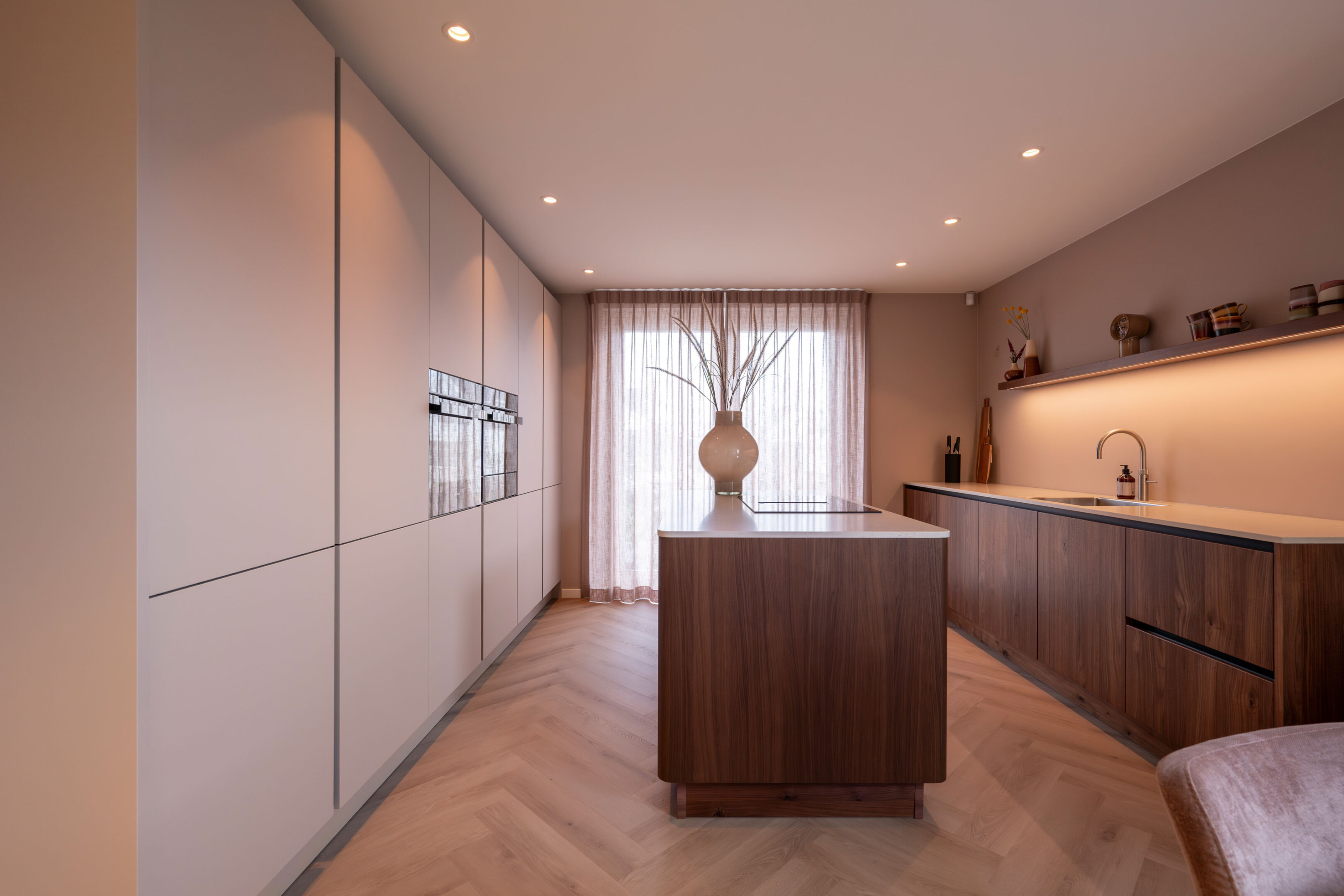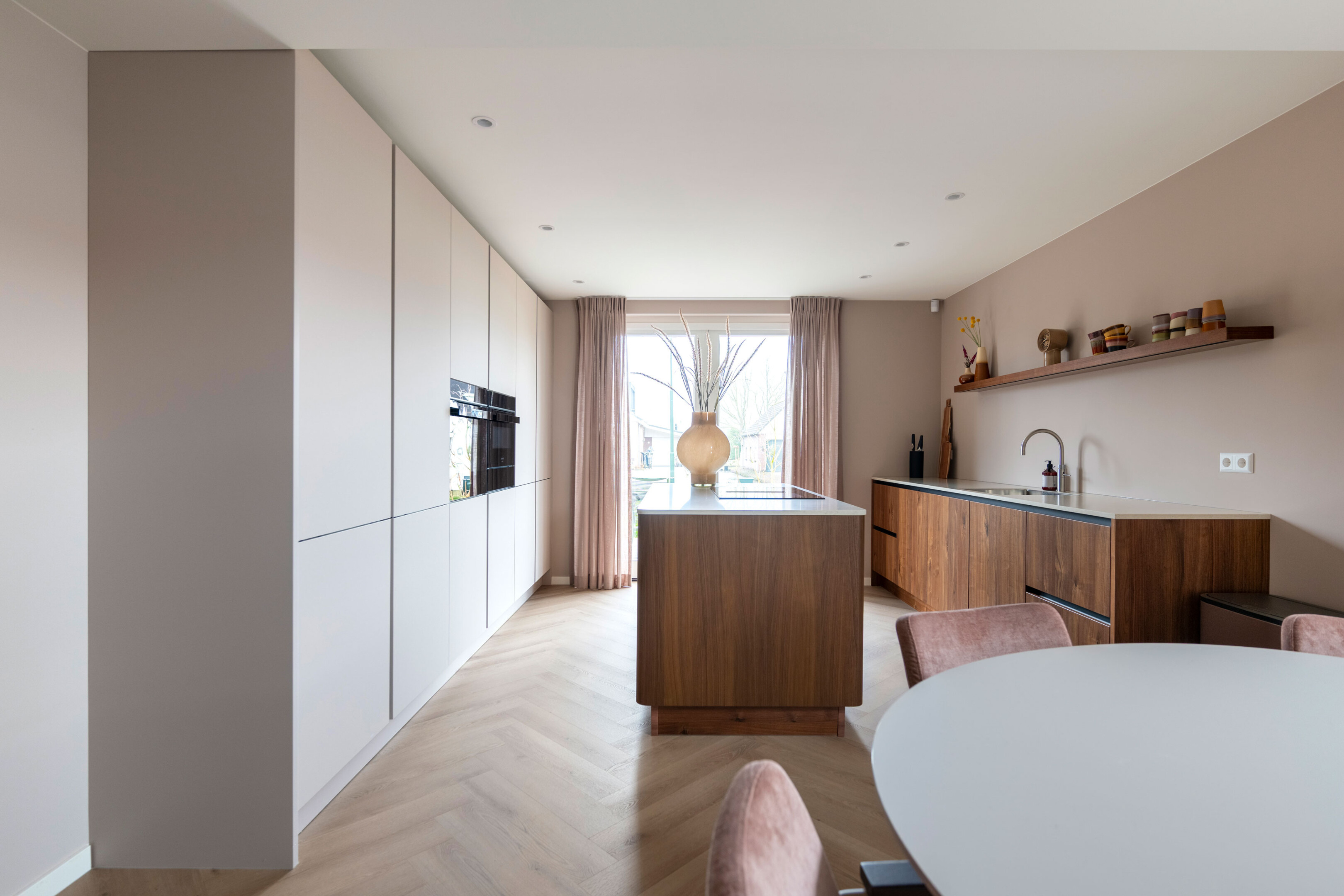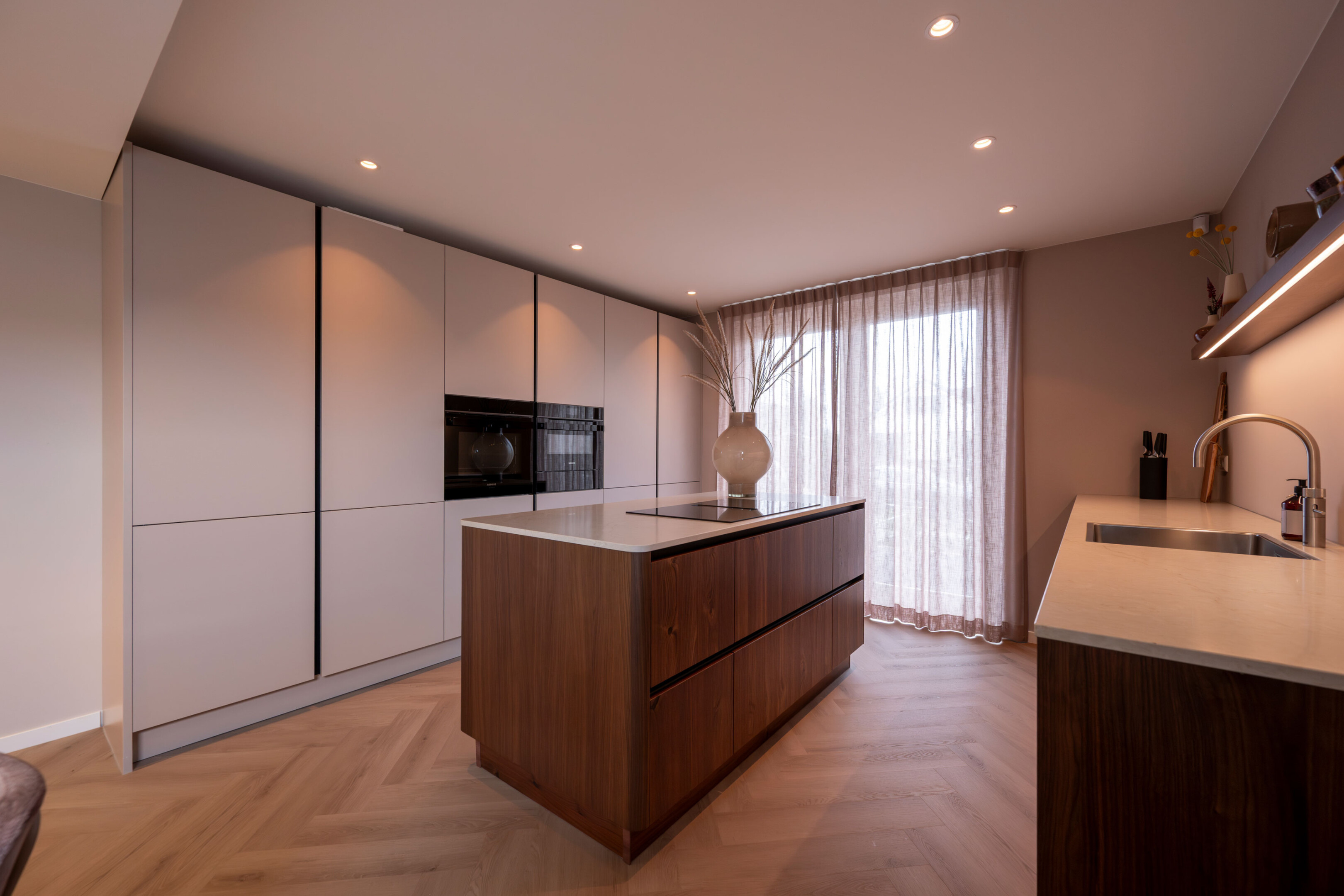 De basis van de keuken is uitgevoerd in Kashmir, een zachte en rustige tint in mat laminaat met een praktische anti-fingerprint laag. Deze ingetogen kleur vormt het perfecte podium voor het pronkstuk van de keuken: het geborstelde notenhout. De natuurlijke houttinten van de lage kasten stralen pure luxe en warmte uit.