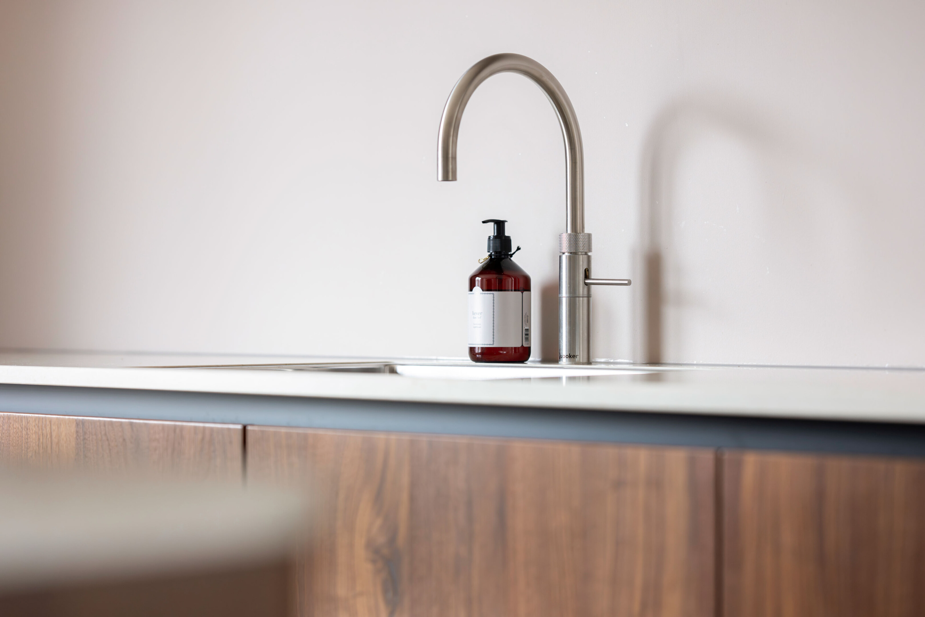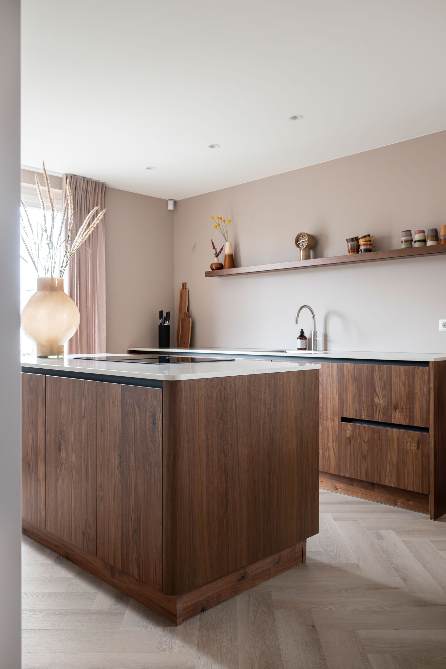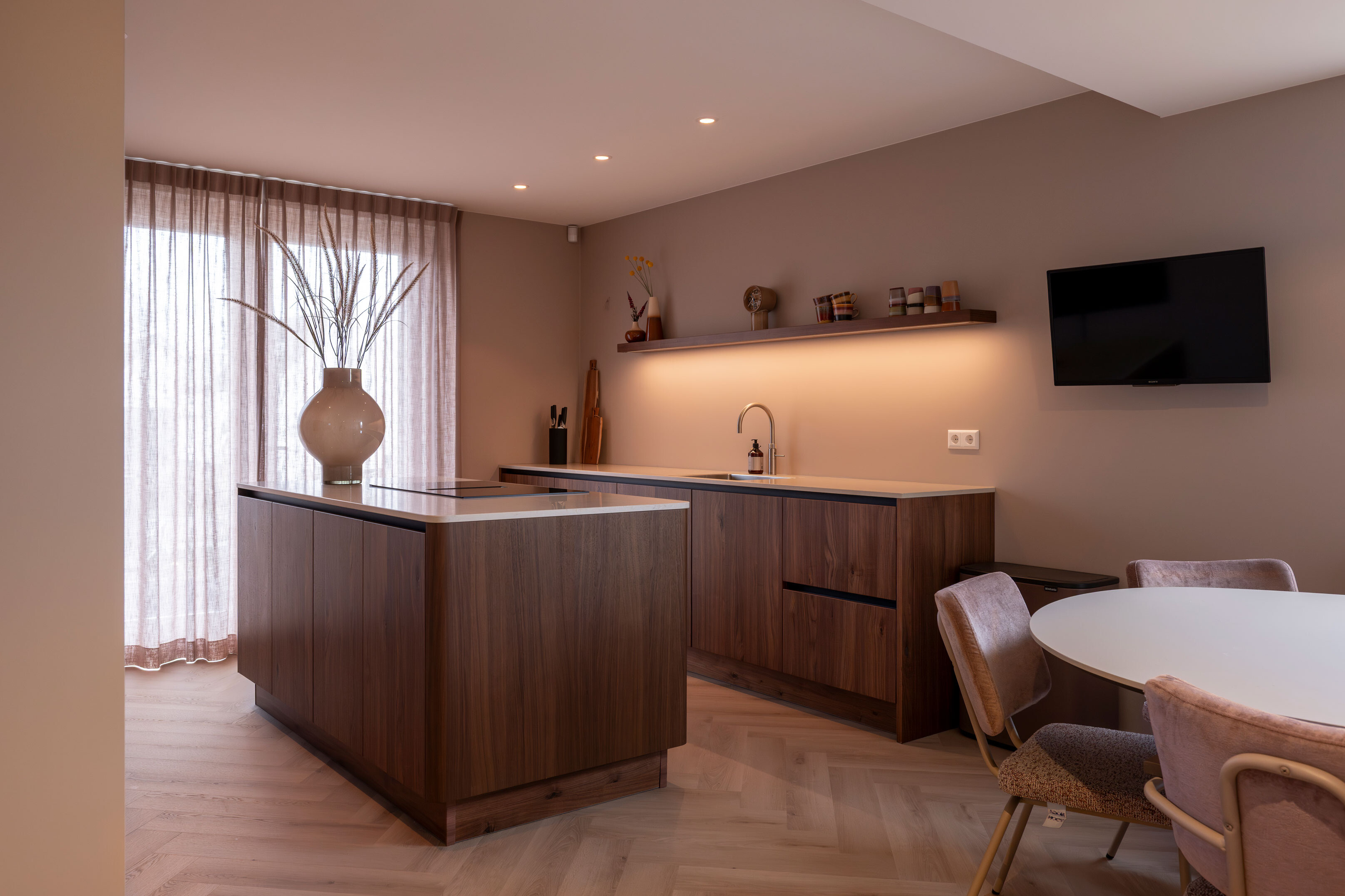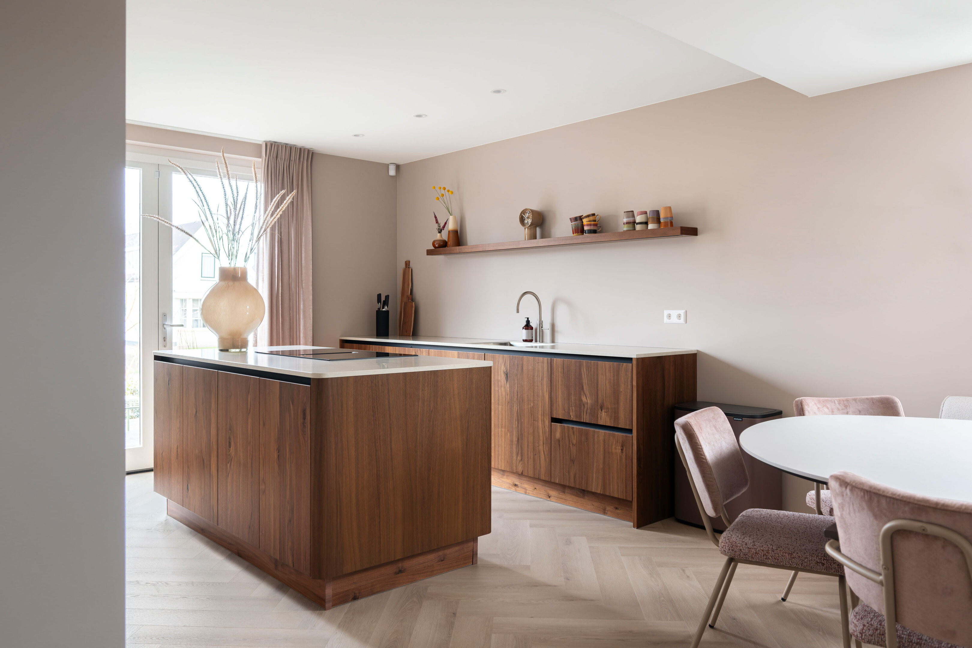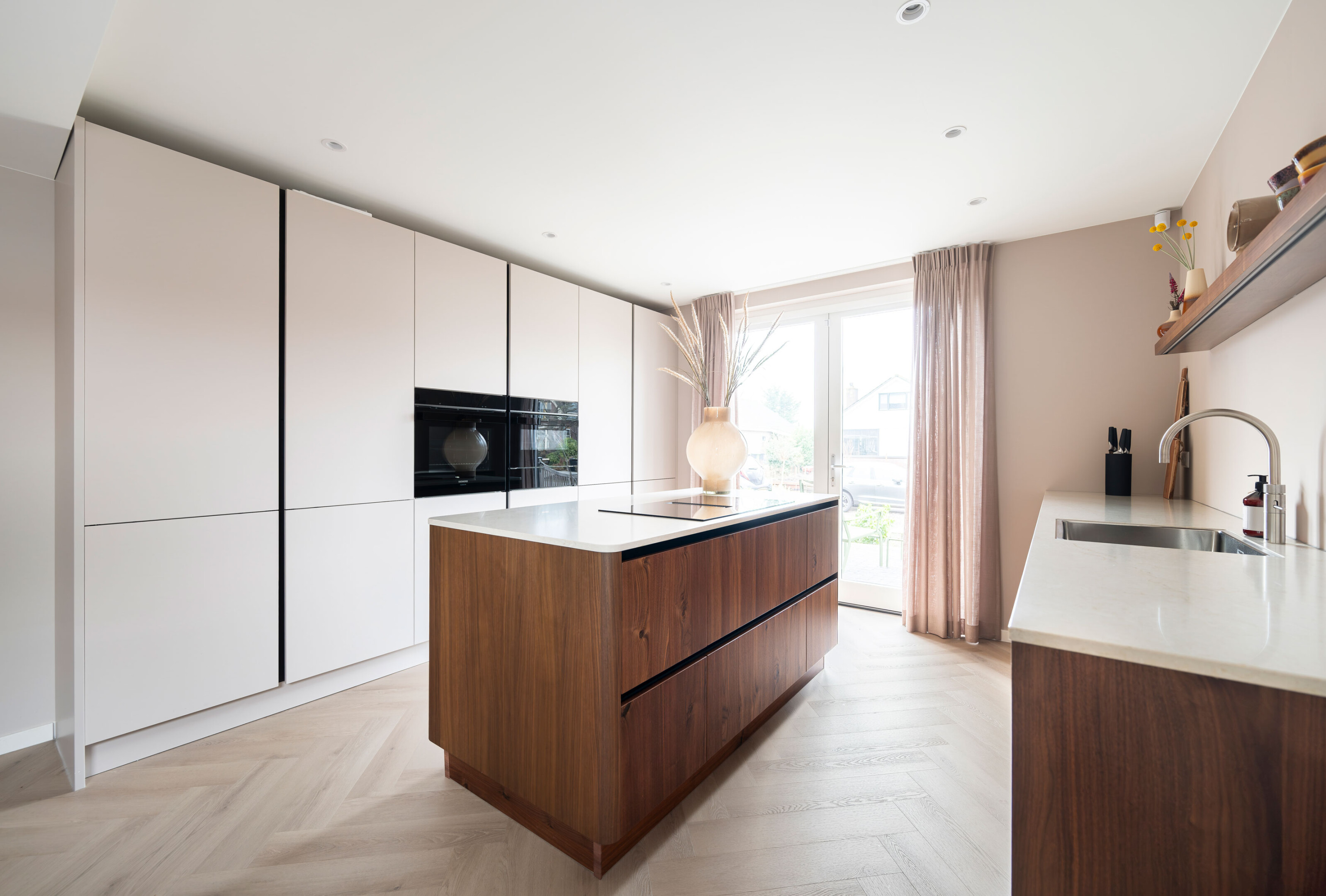 De basis van de keuken is uitgevoerd in Kashmir, een zachte en rustige tint in mat laminaat met een praktische anti-fingerprint laag. Deze ingetogen kleur vormt het perfecte podium voor het pronkstuk van de keuken: het geborstelde notenhout. De natuurlijke houttinten van de lage kasten stralen pure luxe en warmte uit.