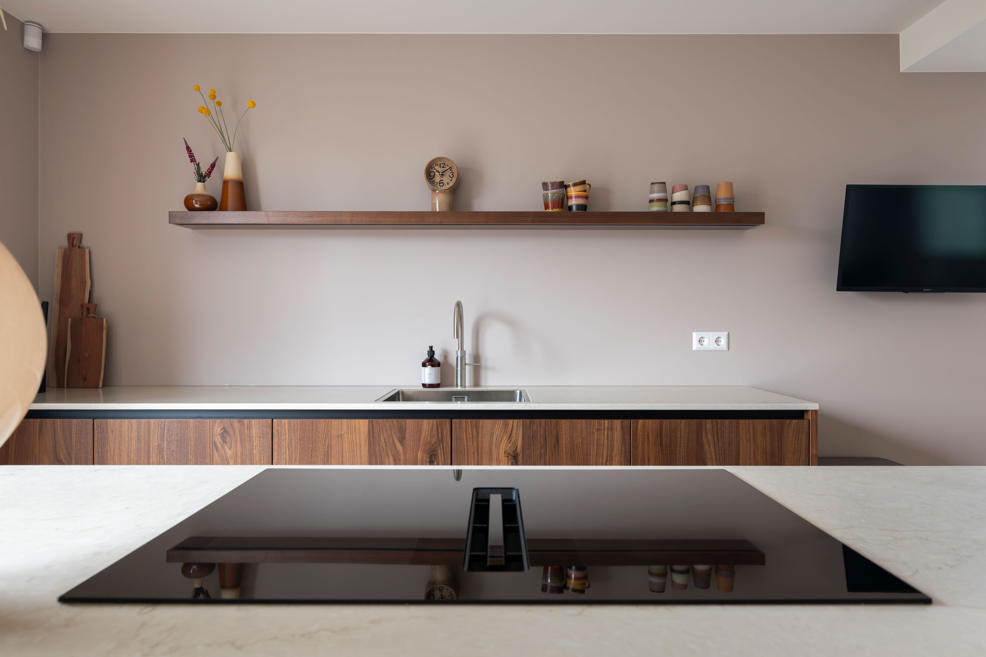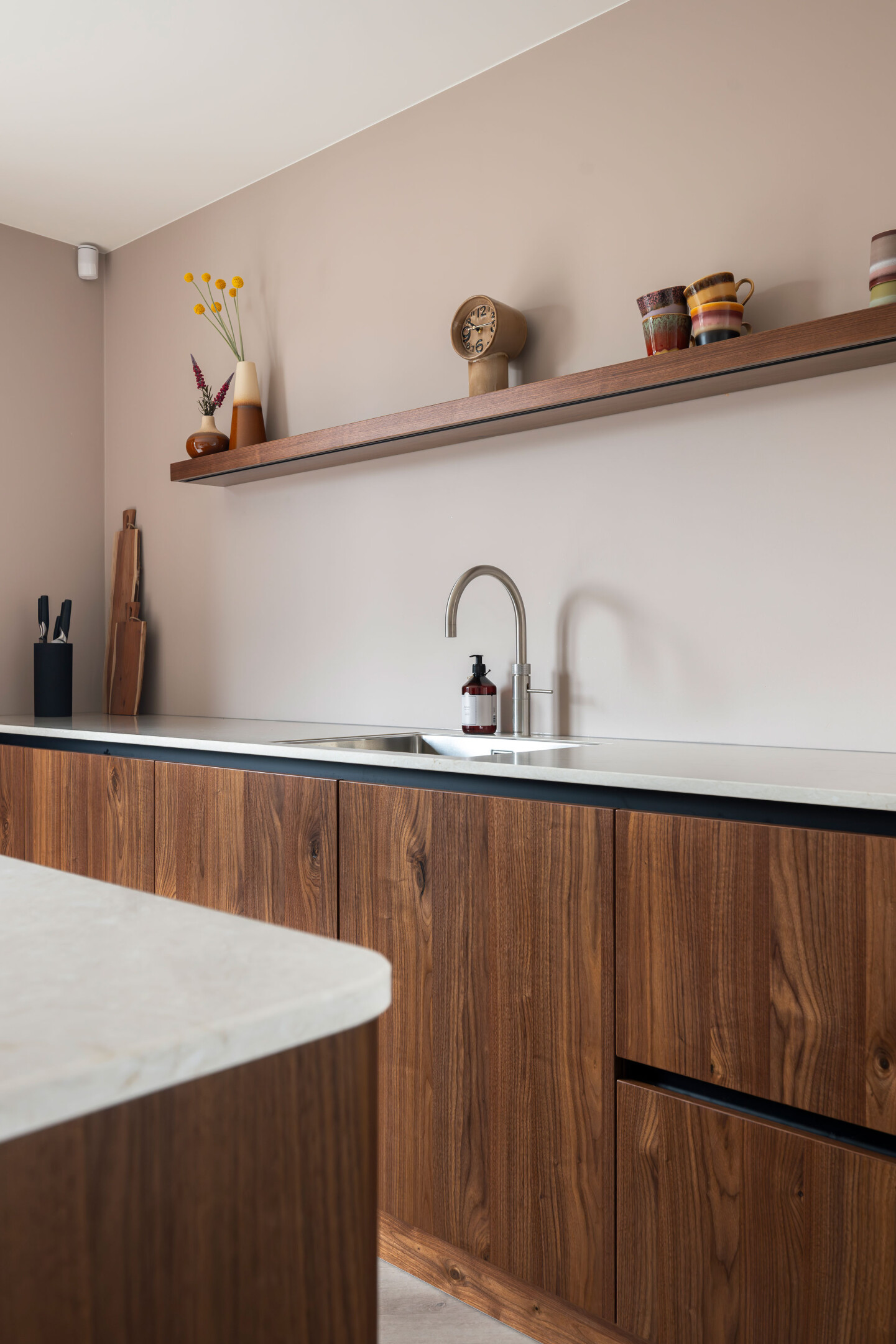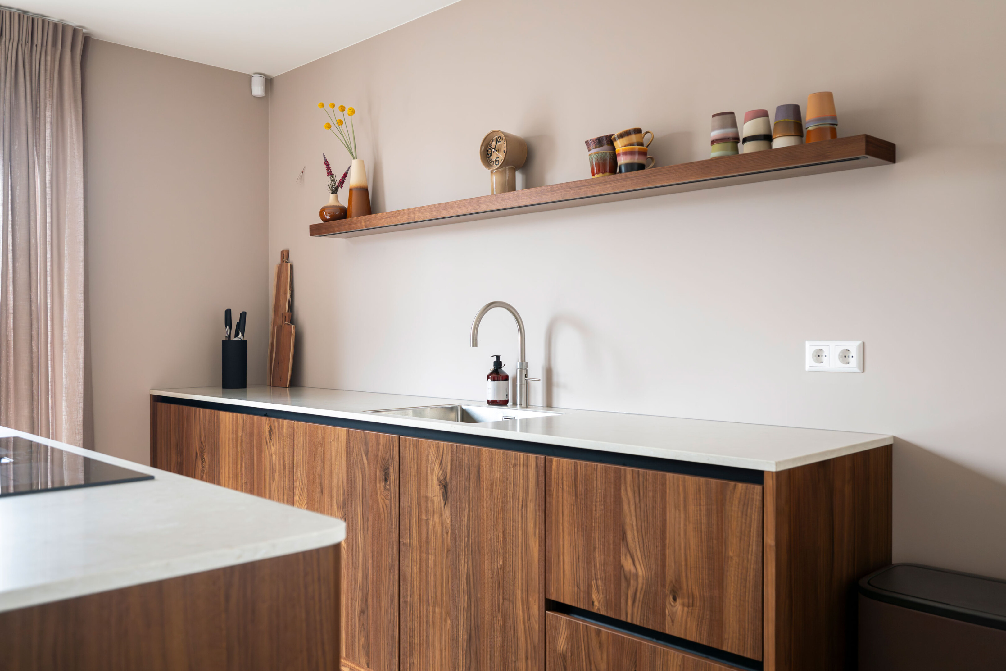 In Bergambacht realiseerden we een keuken die het kloppende hart vormt van het huis. De strakke lijnen van het ontwerp combineren we met ronde hoeken, waardoor de keuken een vriendelijk karakter krijgt. Het notenhout straalt warmte uit, terwijl het composiet werkblad een luxegevoel geeft. En met de moderne apparatuur is deze keuken klaar voor gebruik.