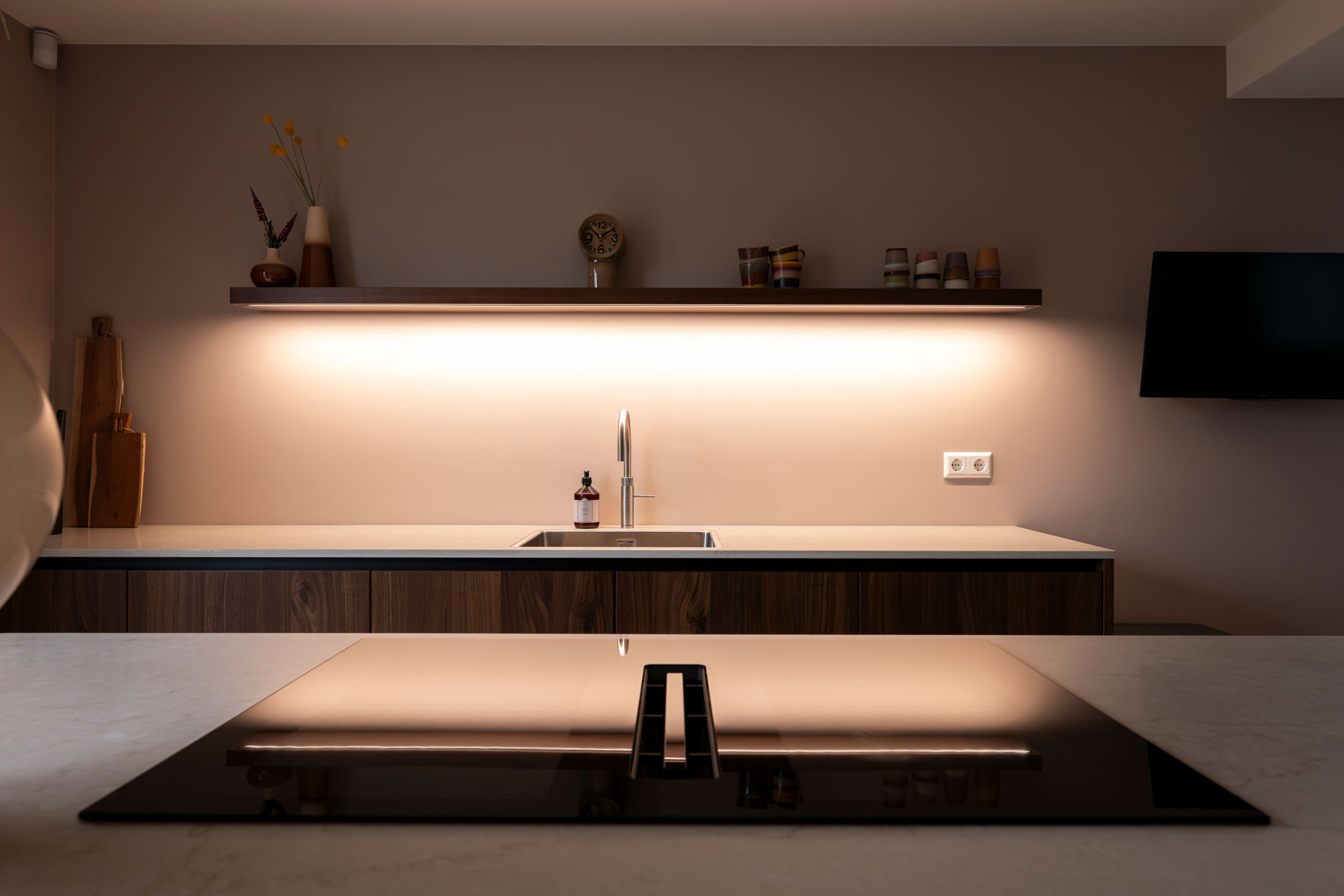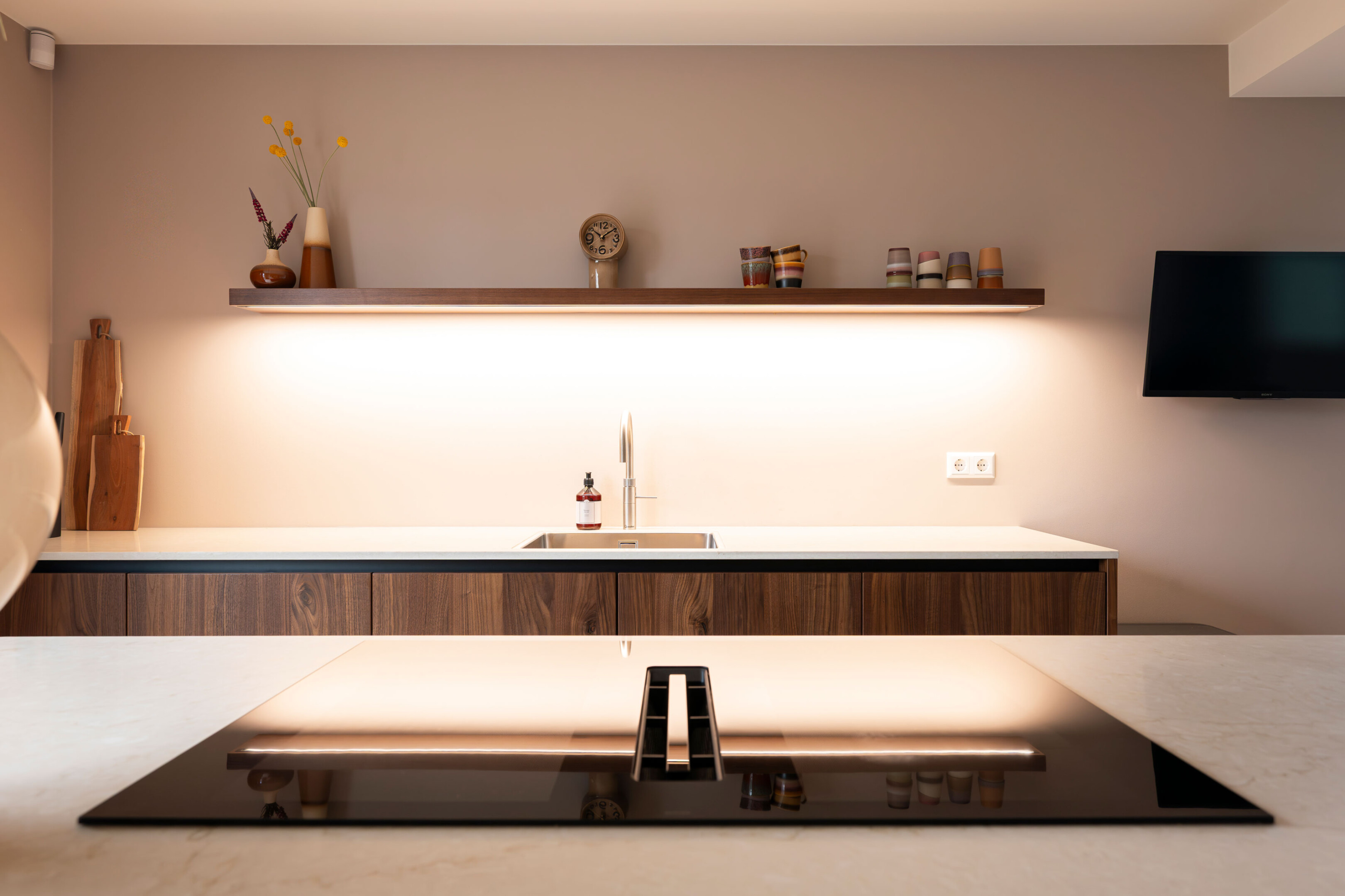 Om het massieve karakter van een kastenwand te doorbreken, kiezen we voor een elegante wandplank. Dit element zorgt voor balans en een luchtig visueel beeld. Het biedt de familie de ruimte voor persoonlijke accenten (zoals mooi servies en sfeervolle decoratie) waardoor de keuken echt tot leven komt.