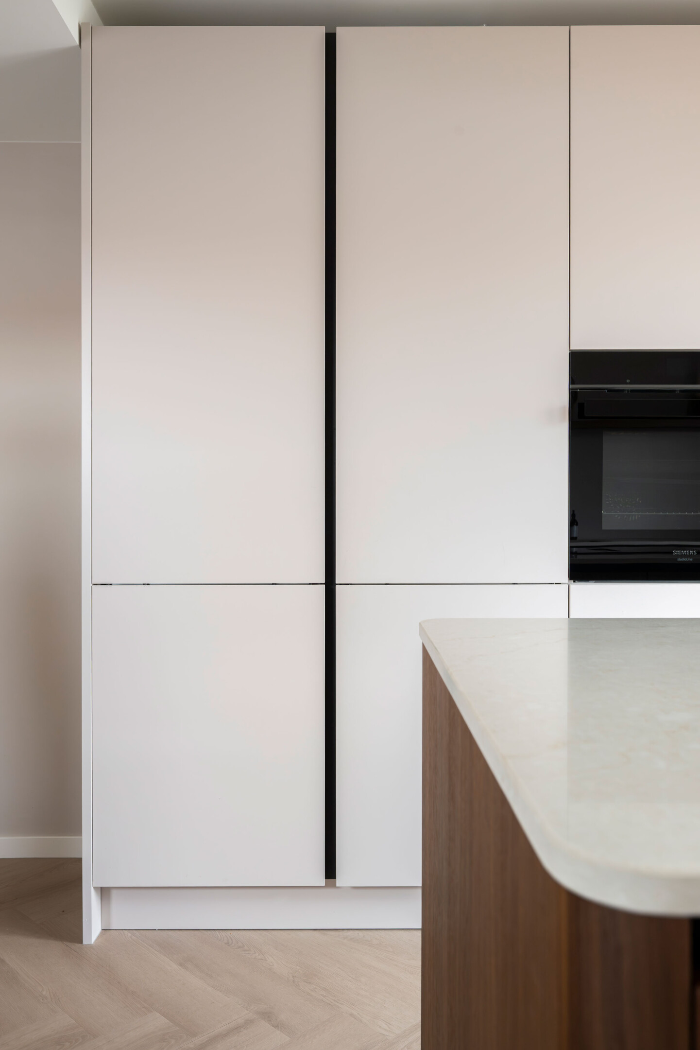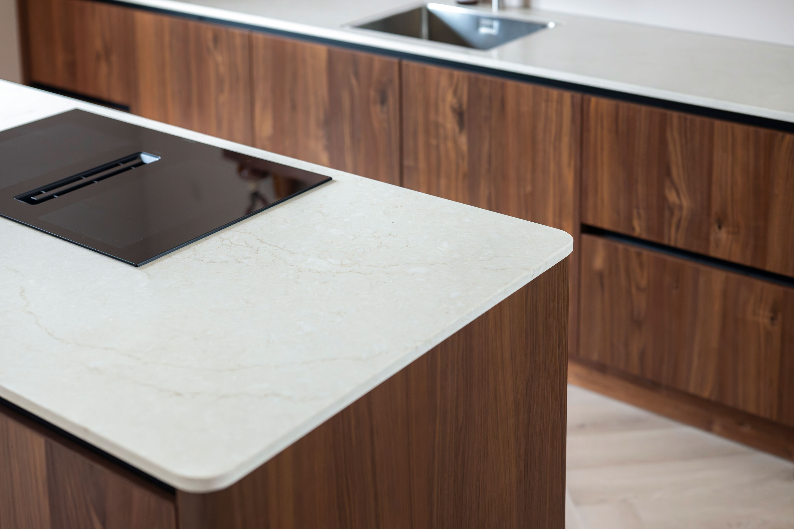 Het kookeiland is de absolute blikvanger. Wat direct opvalt, zijn de afgeronde hoeken. Deze verzachten de strakke lijnen van het ontwerp en geven de keuken een vriendelijk en toegankelijk karakter. Het maakt de doorgang prettiger en de uitstraling net even unieker.