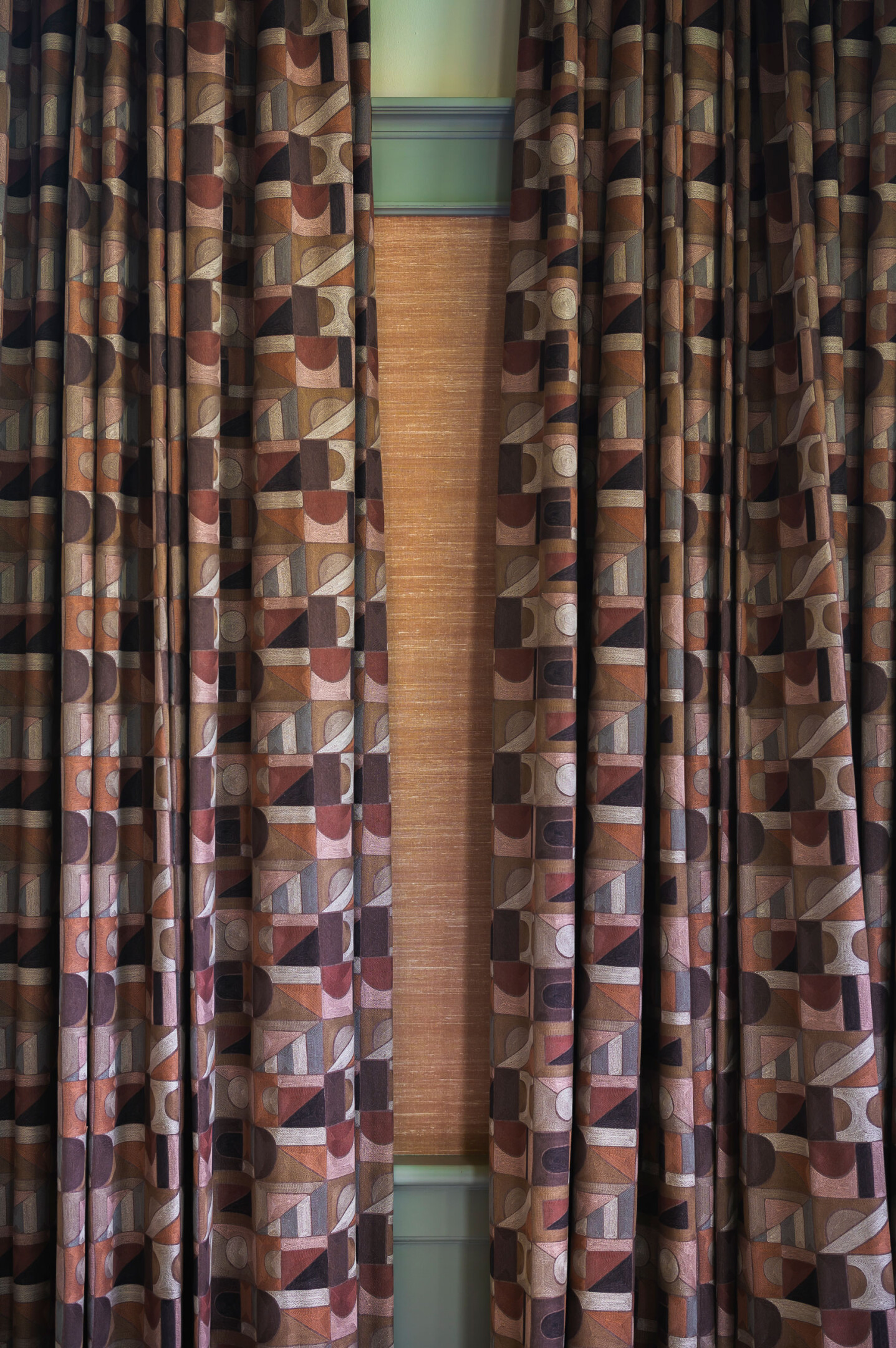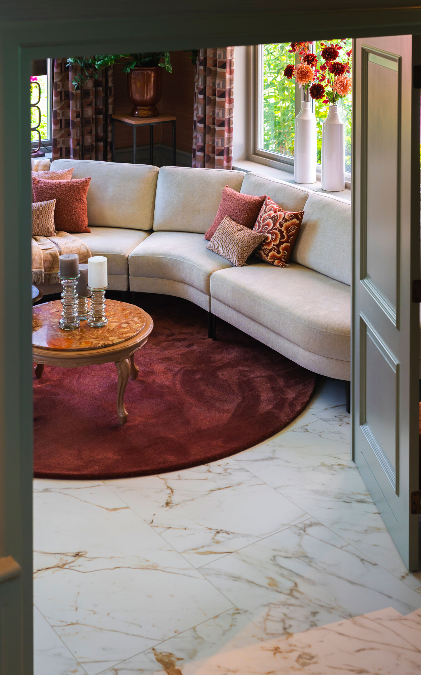 De basis van het interieur wordt gevormd door een doordachte combinatie van meubels, karpetten en unieke raambekleding. Er is bewust gekozen voor warme kleuren en rijke stoffen. De gordijnen met patroon spelen hierin een glansrol: ze laten alle gekozen kleuren uit de ruimte prachtig bij elkaar komen. Dit geeft, ondanks het opvallende dessin, verrassend genoeg juist een heel rustig en kloppend geheel. Zo heeft elke kamer een eigen gezicht, maar voel je overal in huis dezelfde rust en samenhang.