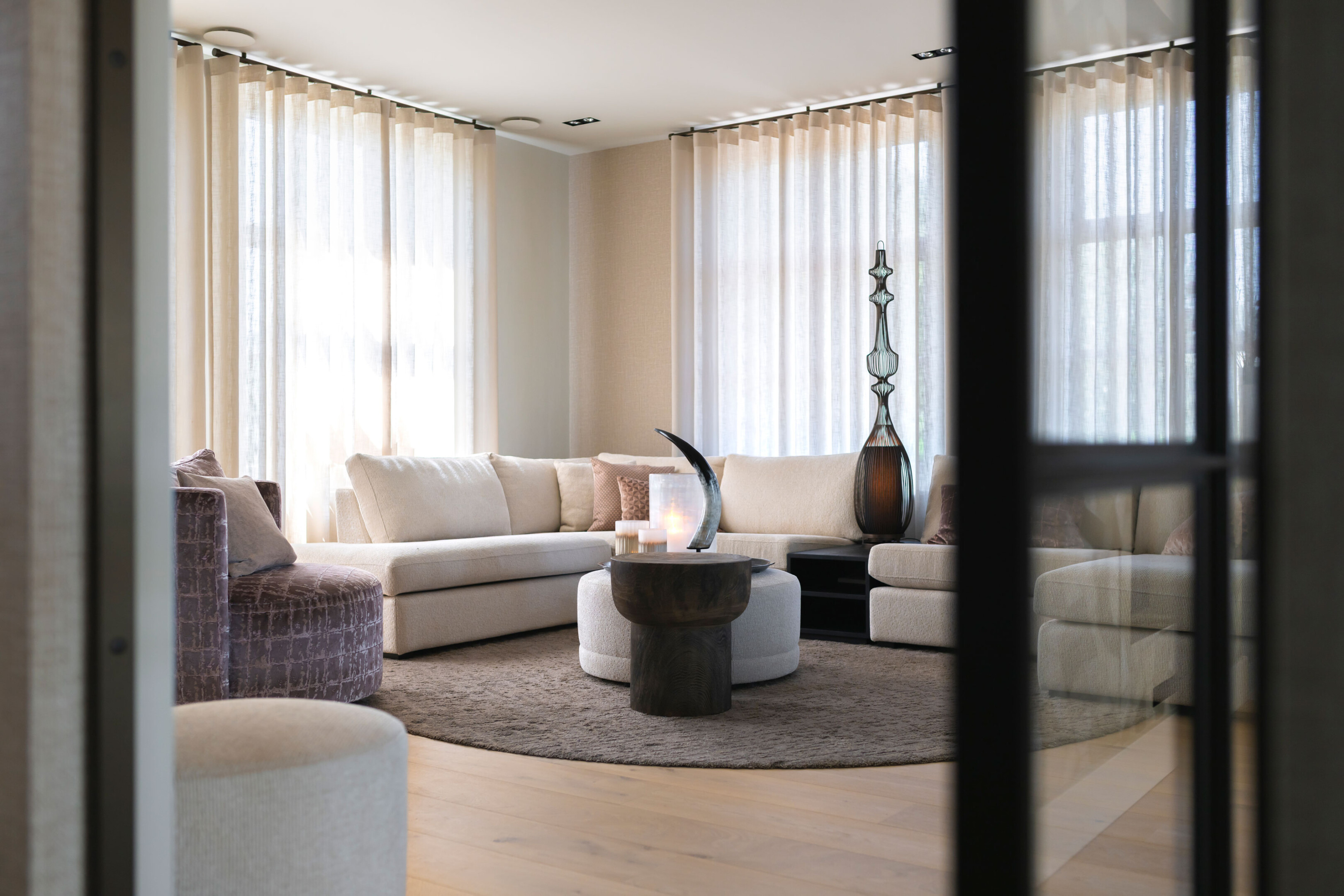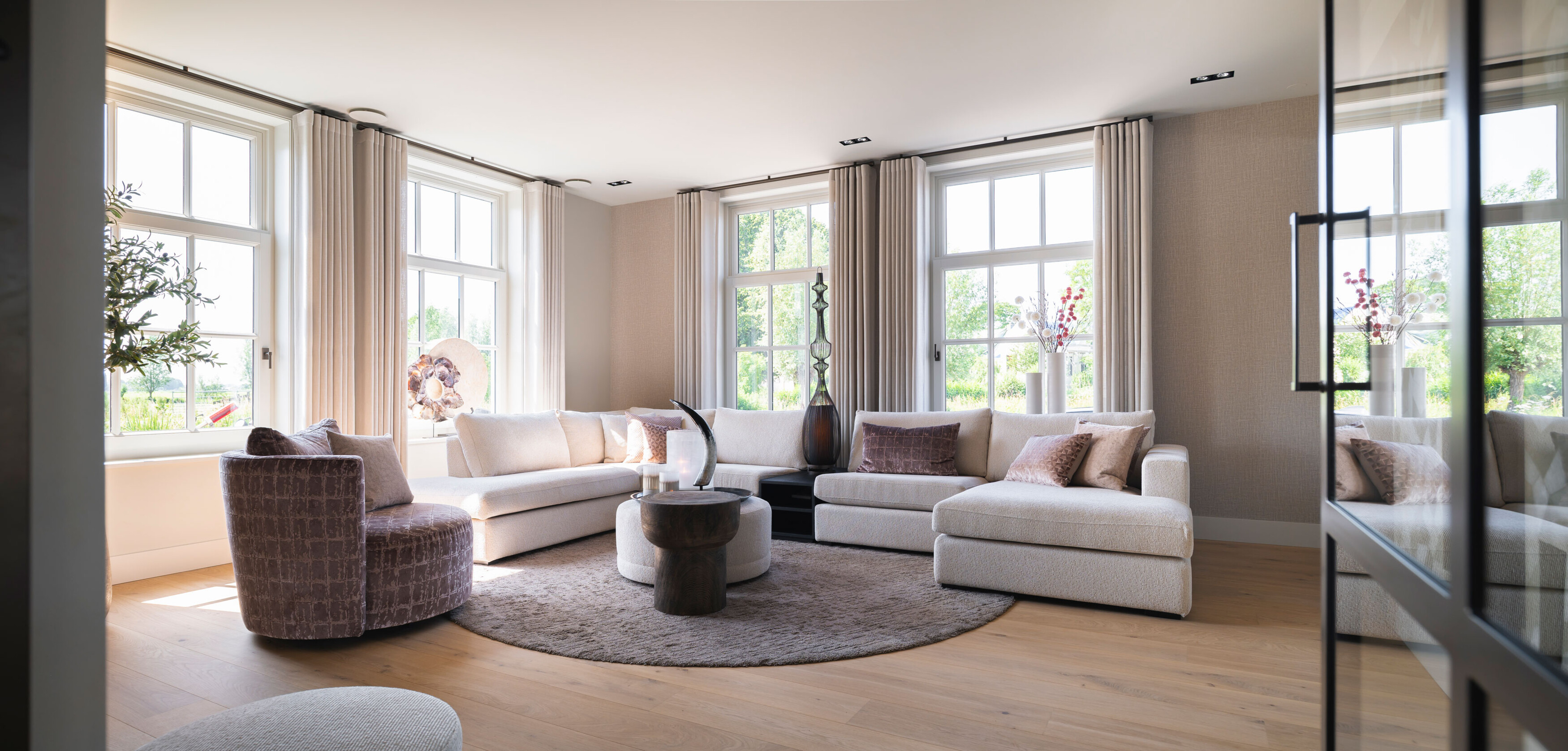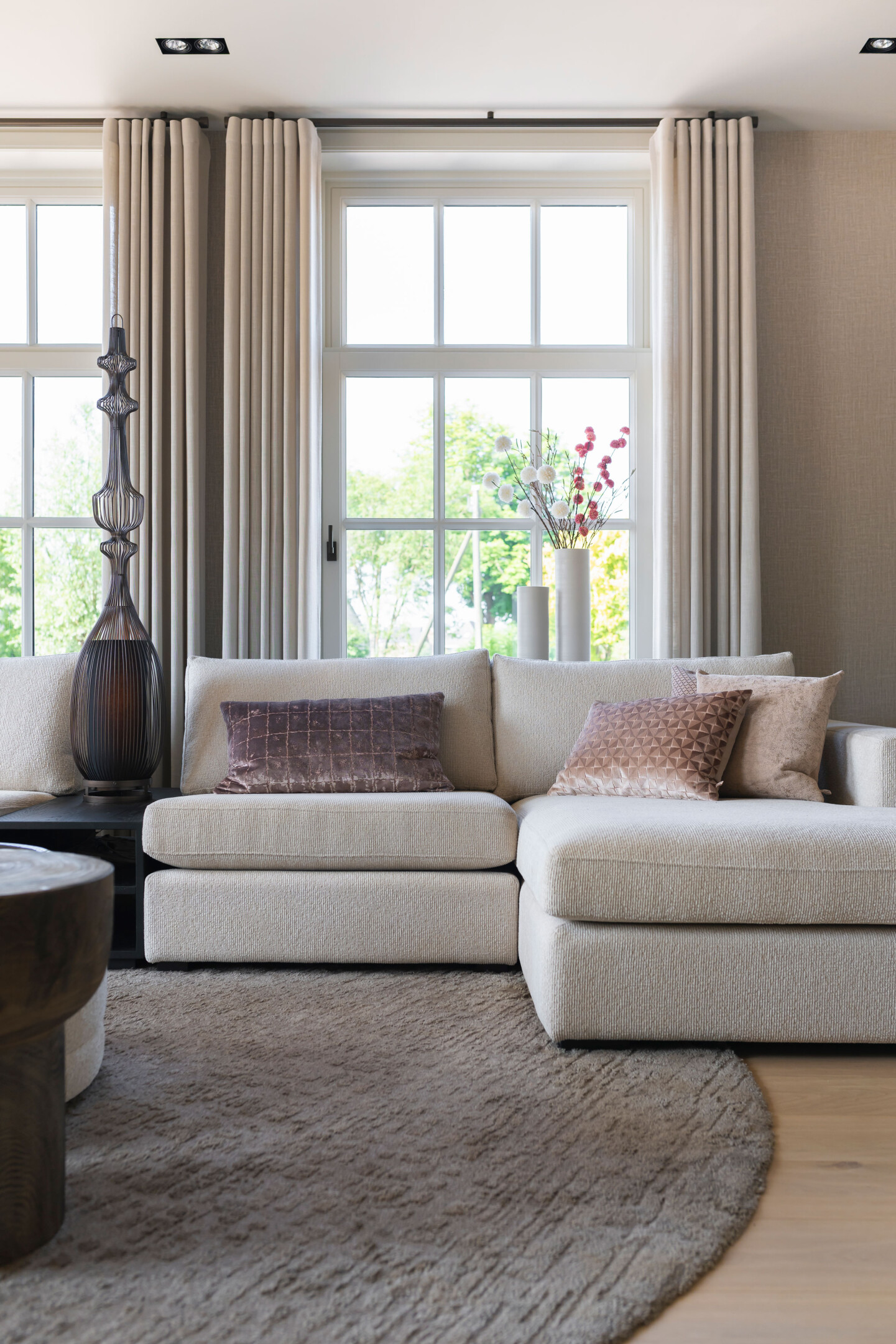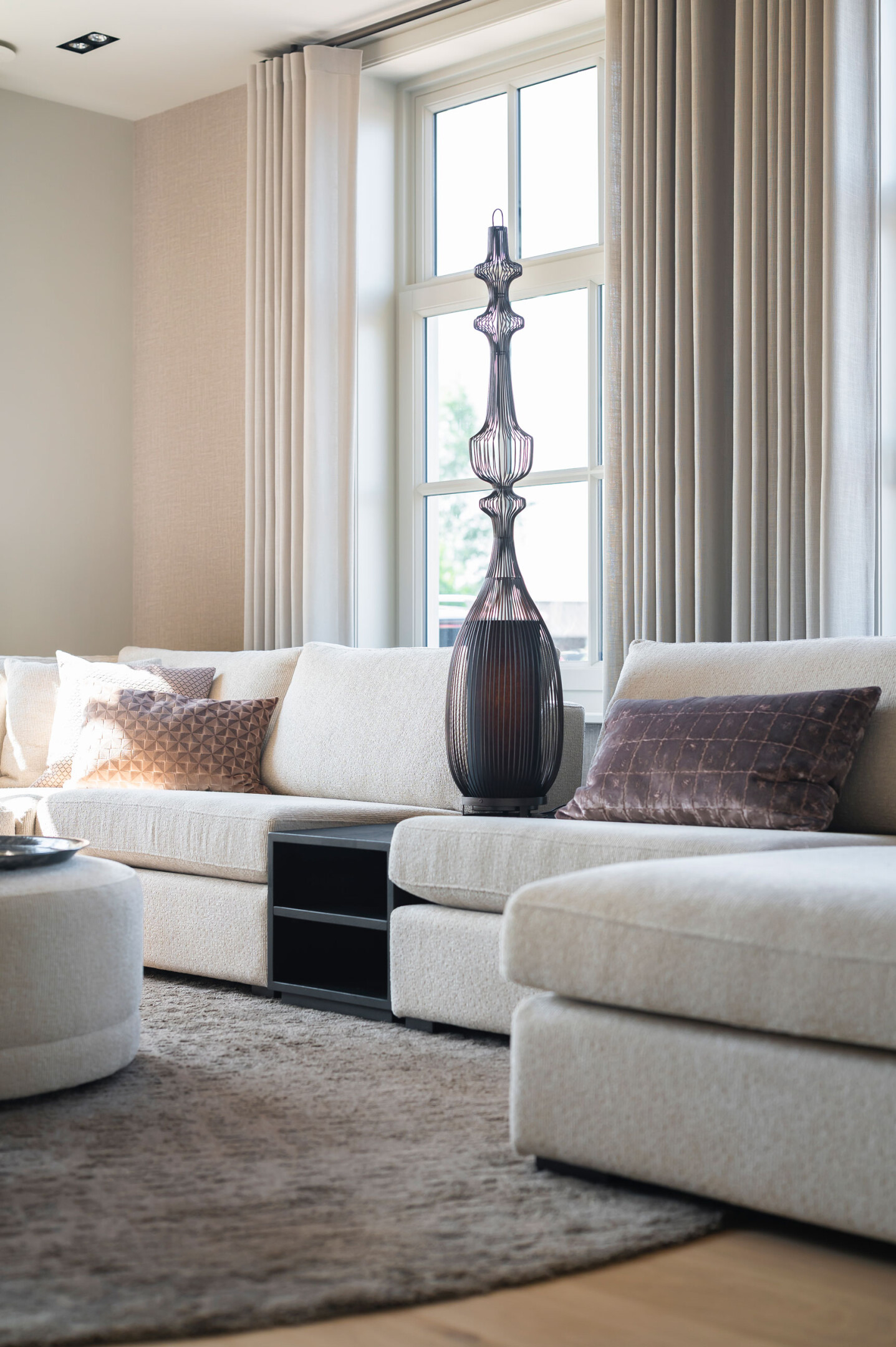 De landelijke bank die ze als eerste zagen, vormt het vertrekpunt. Vanuit daar maken Berthun en Julianne een plan voor de hele woning: vloeren, gordijnen, behang én een lichtplan. “Het 3D-ontwerp hielp ons enorm. Zo konden we ons huis al beleven terwijl de bouw nog volop bezig was. Dat gaf veel vertrouwen.”