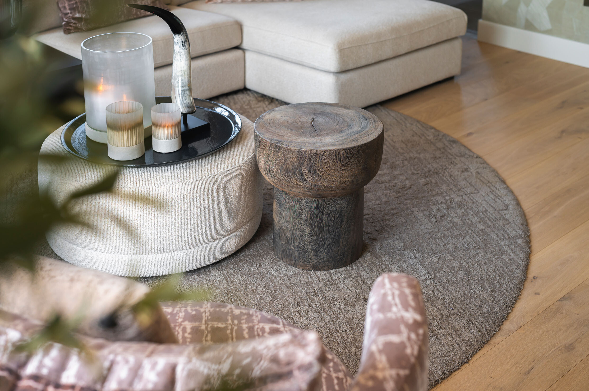 De basis bestaat uit warme aardetinten, natuurlijke materialen en een robuuste eiken vloer. Soet voegt daar verrassende accenten aan toe: een paarse fauteuil als blikvanger en behang bij de haard. “Die paarse lavendelkleur en het behang hadden we zelf nooit bedacht, maar het zorgt juist voor een leuke eyecatcher.” Berthun: “We hebben geprobeerd een mix te maken tussen landelijk en tijdloos. Paars was vroeger al een weinig voorkomende kleur, moeilijk te maken en daardoor niet vaak gekozen. Juist met deze paarse accenten geven we een exclusieve twist aan het interieur.”
