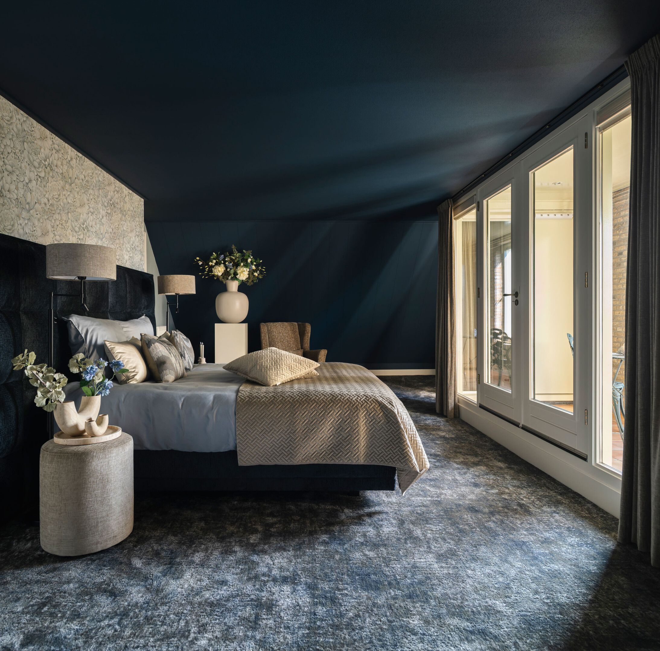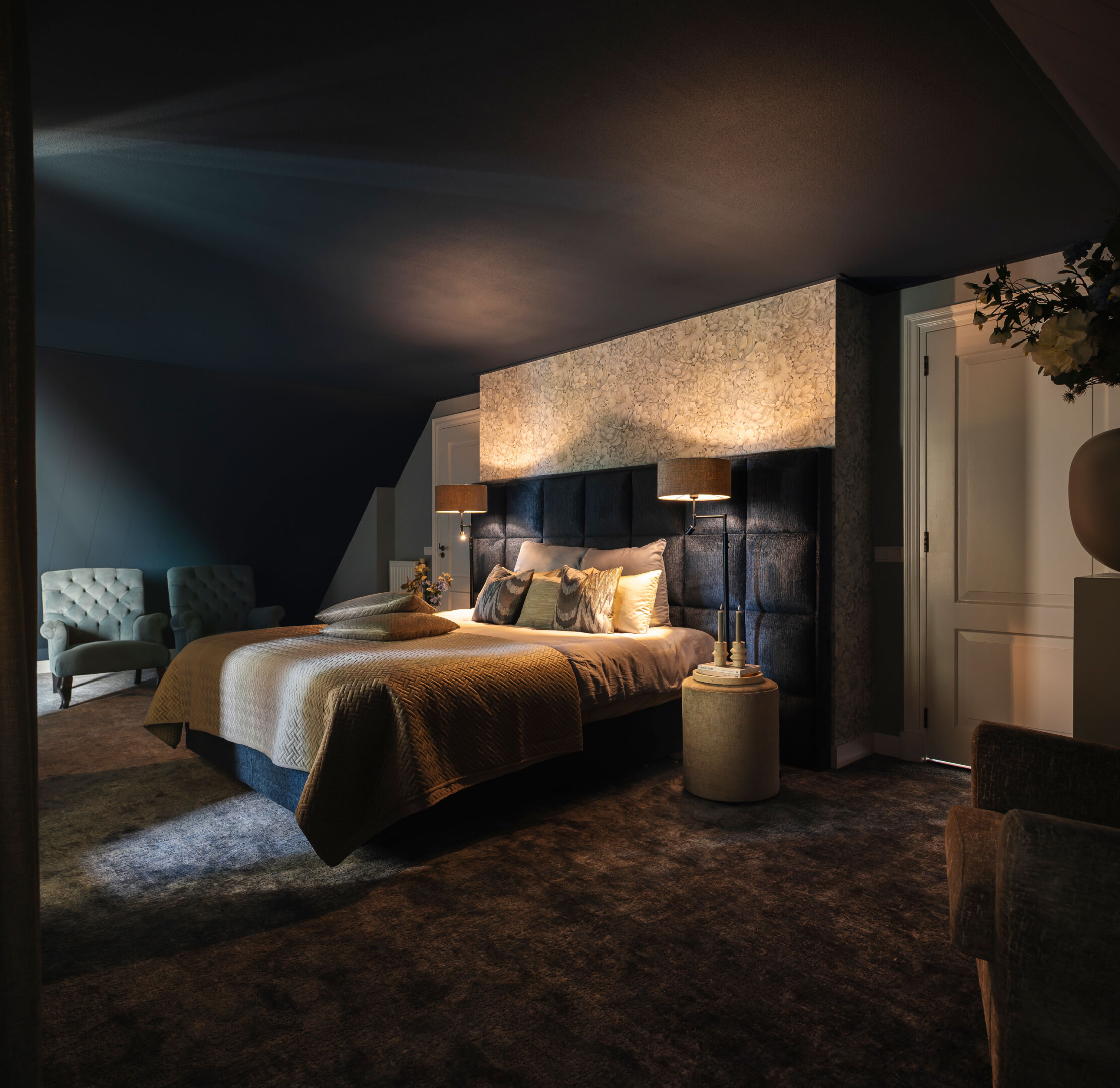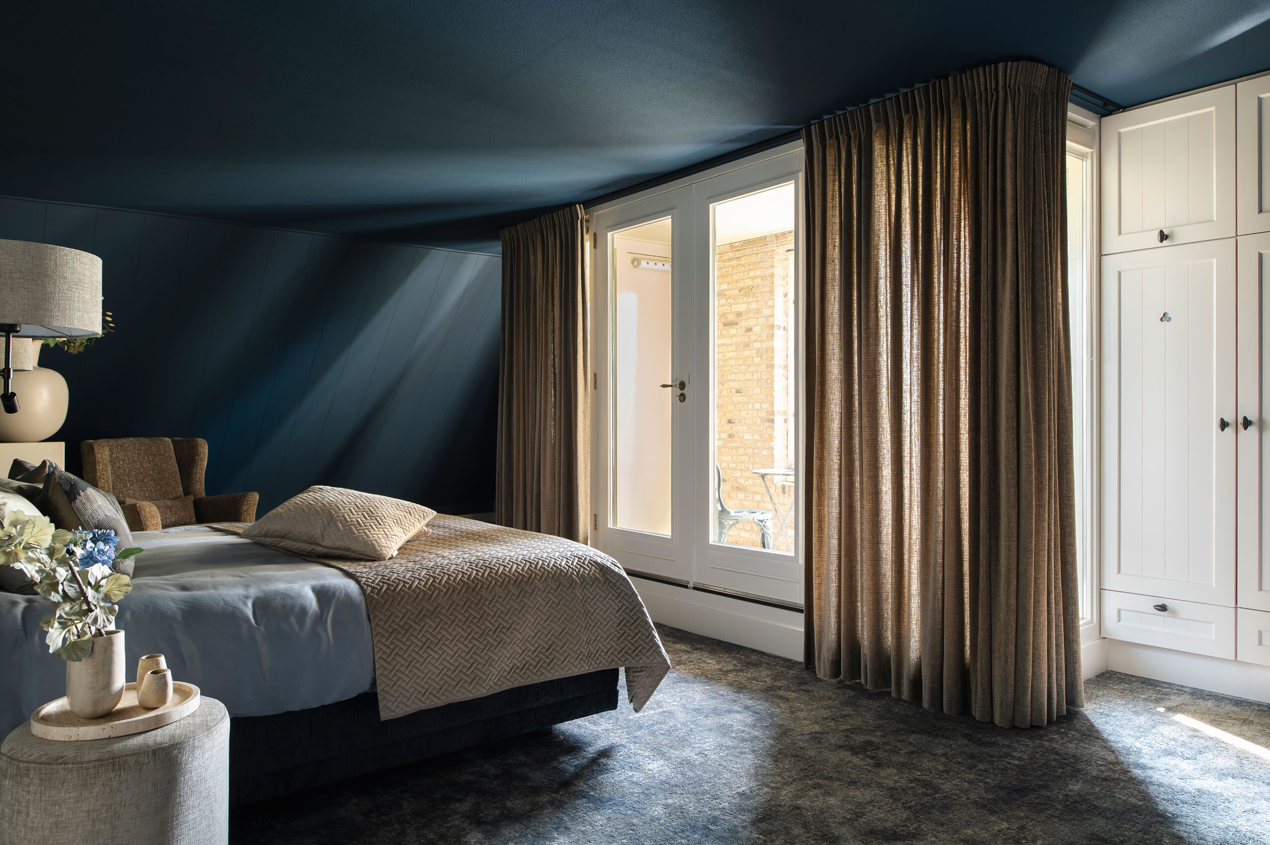 De slaapkamer straalt nu rust en geborgenheid uit. De donkerblauwe wanden zorgen voor een knusse sfeer, terwijl de warme zandtinten in gordijnen en accessoires het geheel verzachten. Door materialen en structuren met elkaar te combineren, ontstaat een ruimte die luxe uitstraalt zonder afstandelijk te worden. Het bed met het hoge hoofdbord vormt het natuurlijke middelpunt van de kamer. De zachte stoffen nodigen uit om te ontspannen, terwijl de verlichting ’s avonds warmte brengt. Door de juiste balans tussen kleur en materiaal voelt de slaapkamer rustig en warm aan.