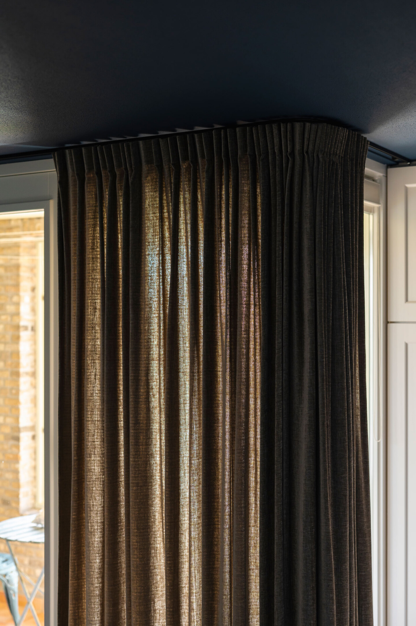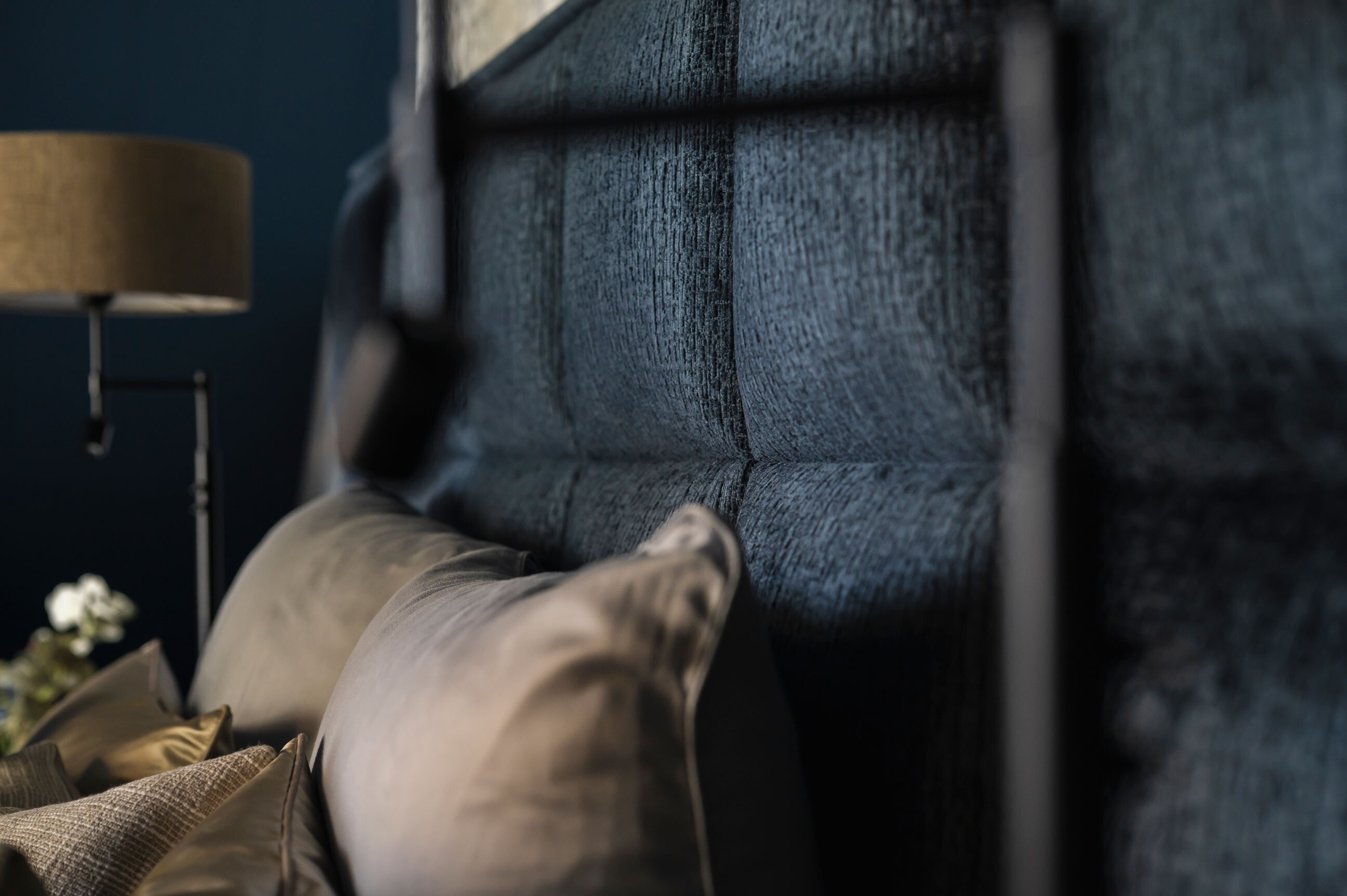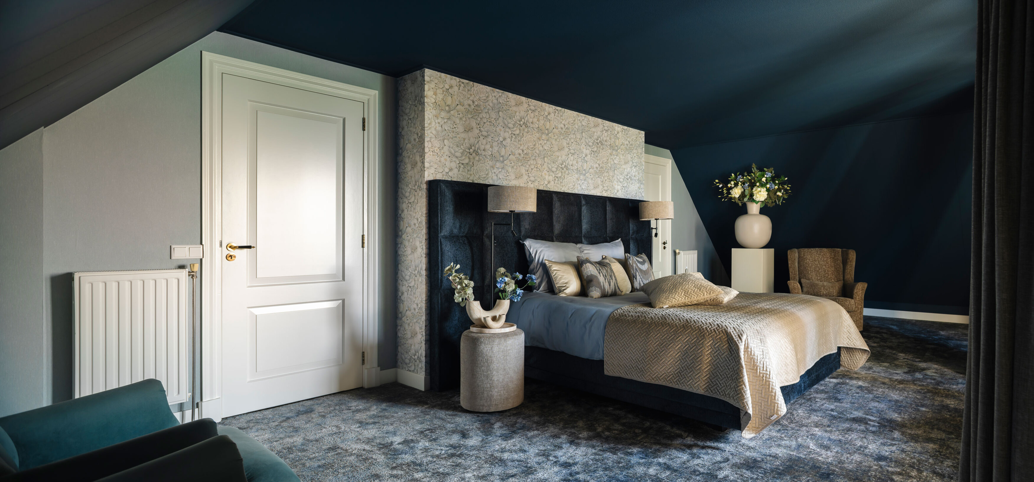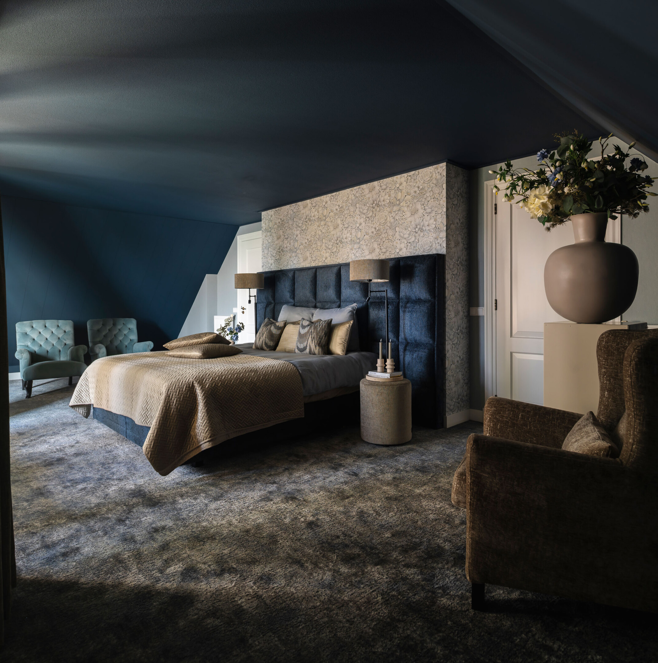 De slaapkamer straalt nu rust en geborgenheid uit. De donkerblauwe wanden zorgen voor een knusse sfeer, terwijl de warme zandtinten in gordijnen en accessoires het geheel verzachten. Door materialen en structuren met elkaar te combineren, ontstaat een ruimte die luxe uitstraalt zonder afstandelijk te worden. Het bed met het hoge hoofdbord vormt het natuurlijke middelpunt van de kamer. De zachte stoffen nodigen uit om te ontspannen, terwijl de verlichting ’s avonds warmte brengt. Door de juiste balans tussen kleur en materiaal voelt de slaapkamer rustig en warm aan.