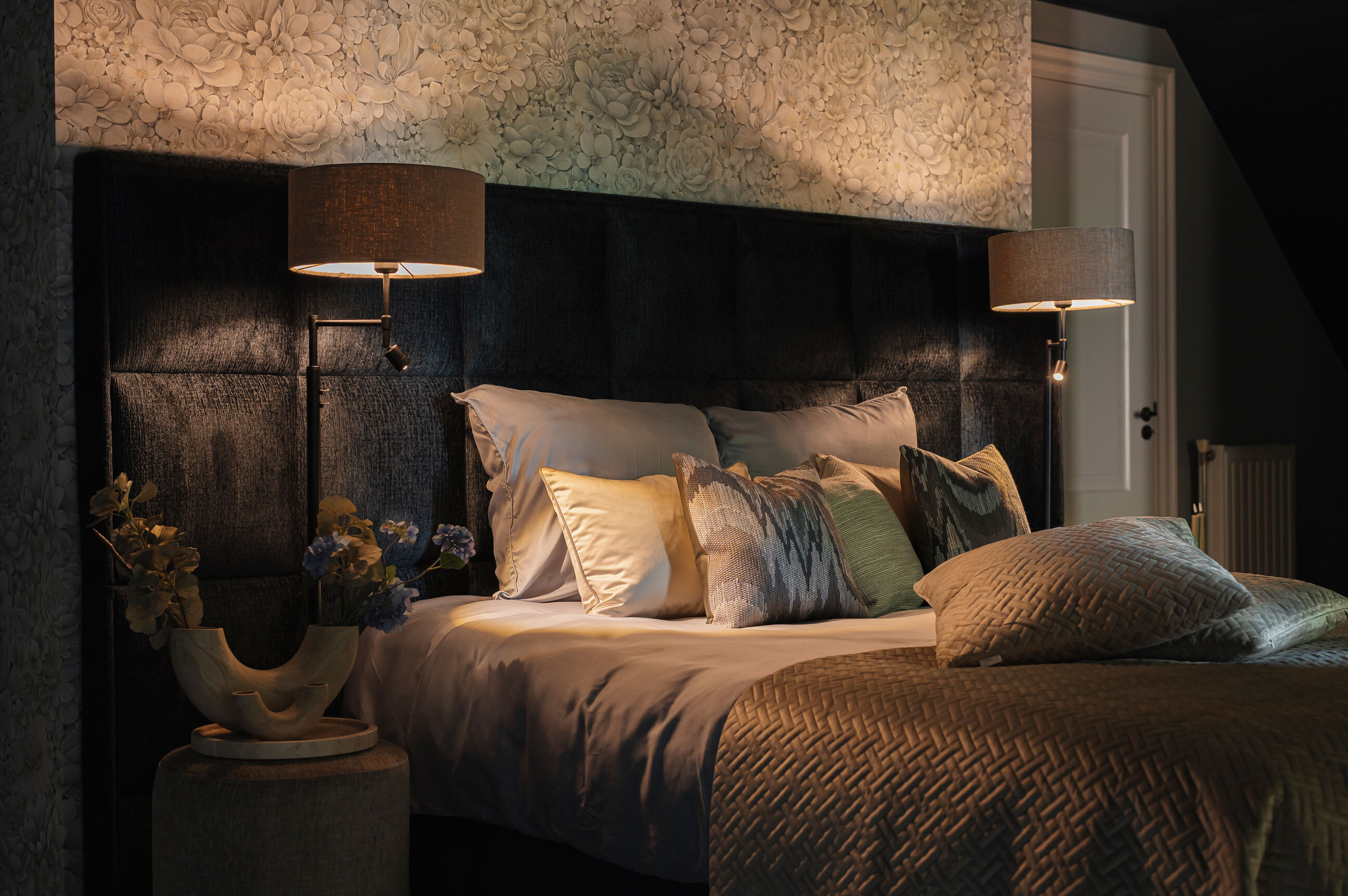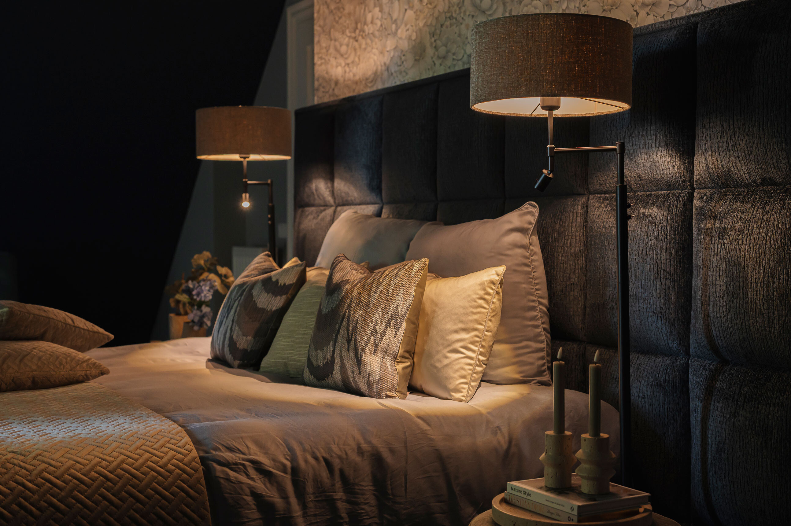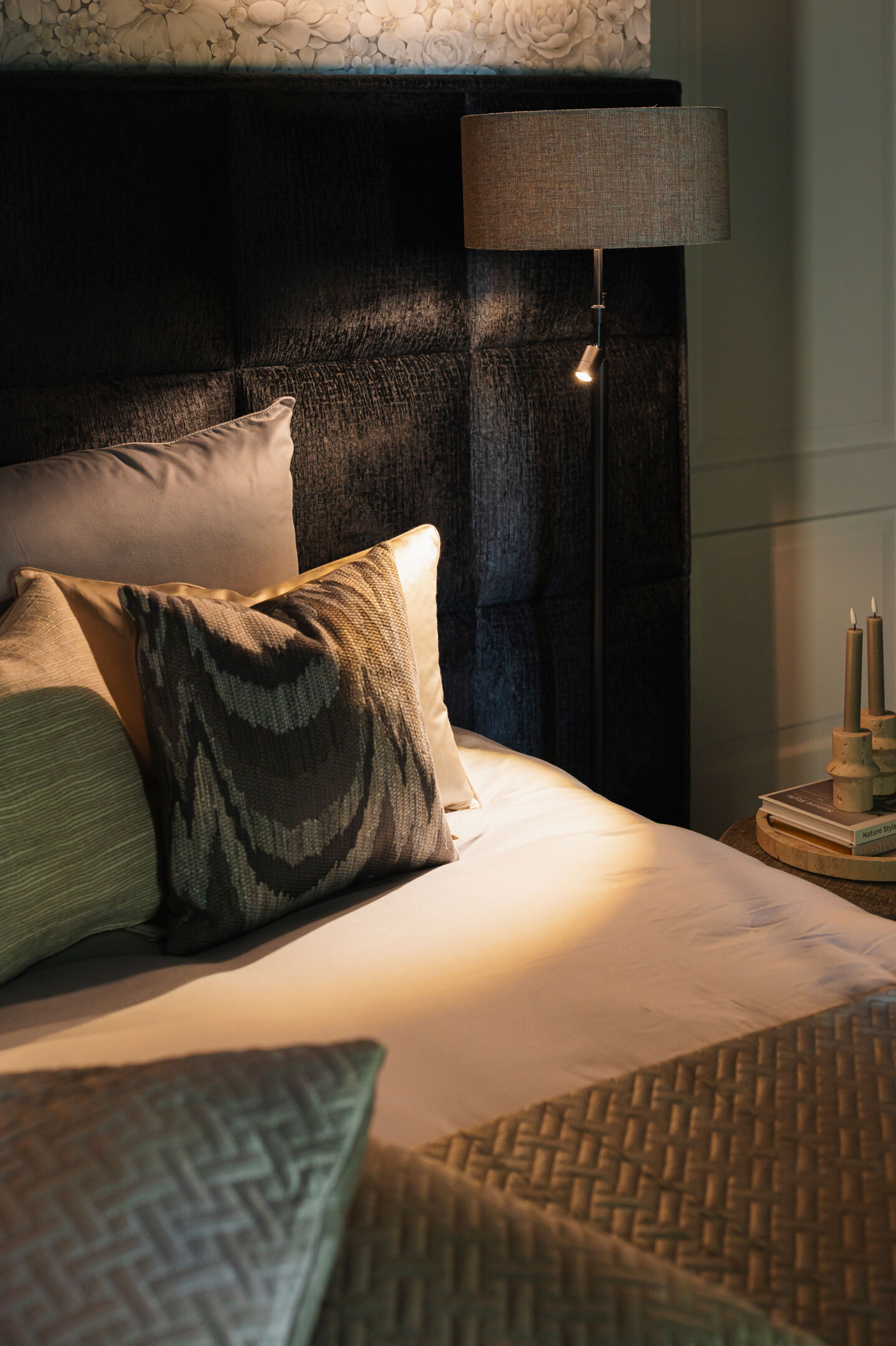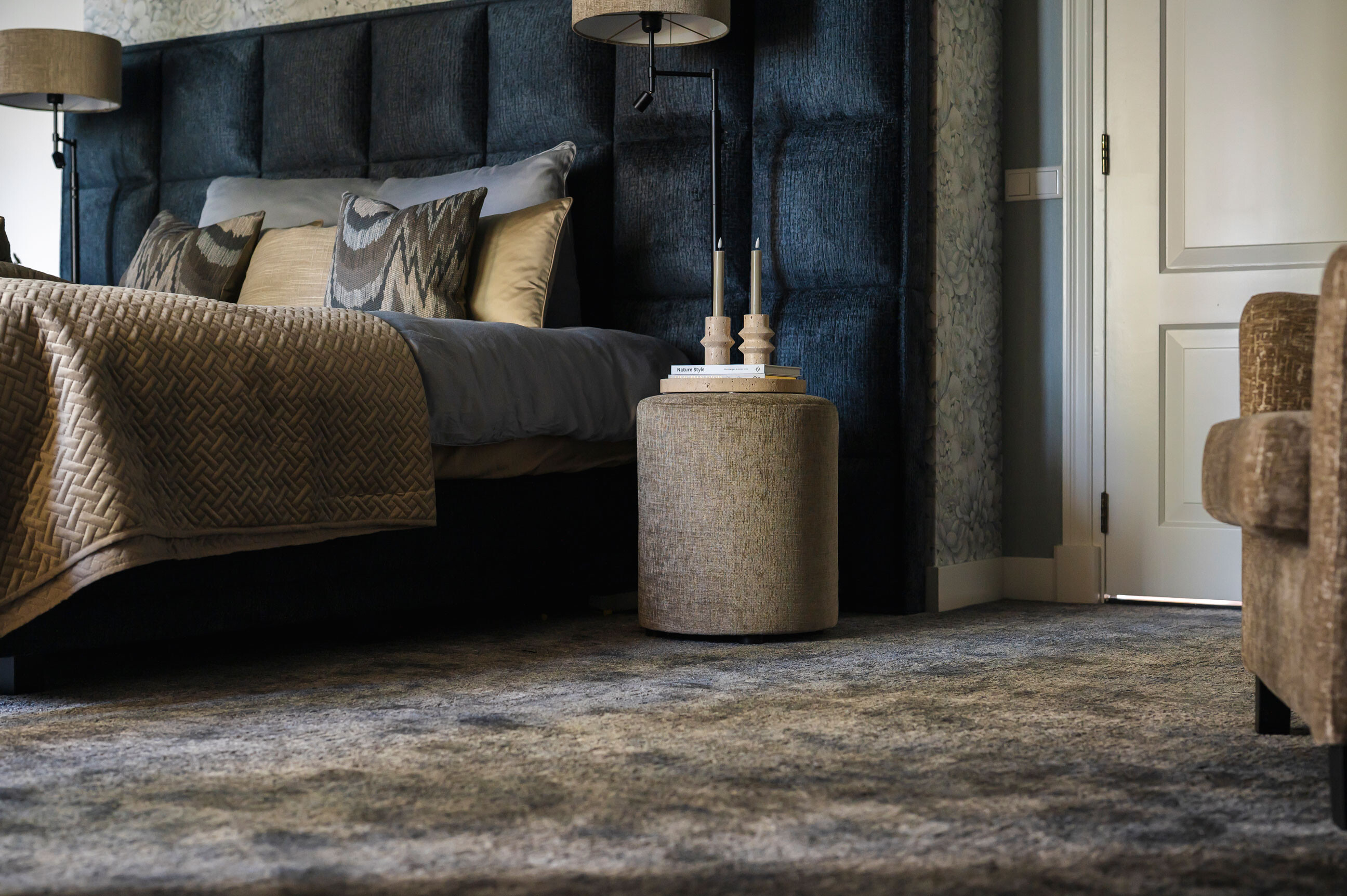 Het begint met het kiezen van het bed: een maatwerk boxspring met een uniek hoofdbord dat meteen de toon zet voor de rest van de ruimte. Vanuit die basis stemmen we kleuren en materialen op elkaar af. Daarna volgt het tapijt, waarover de meningen in het begin uiteenlopen. Mevrouw denkt aan effen, meneer aan bewerkt. Door de varianten naast elkaar te leggen en het geheel te bekijken, ziet ook mevrouw hoe een subtiel patroon juist rust én diepte geeft aan de grote ruimte.
