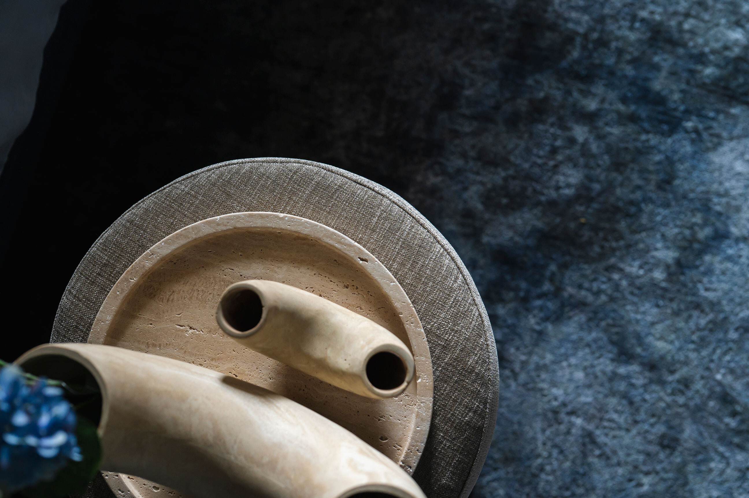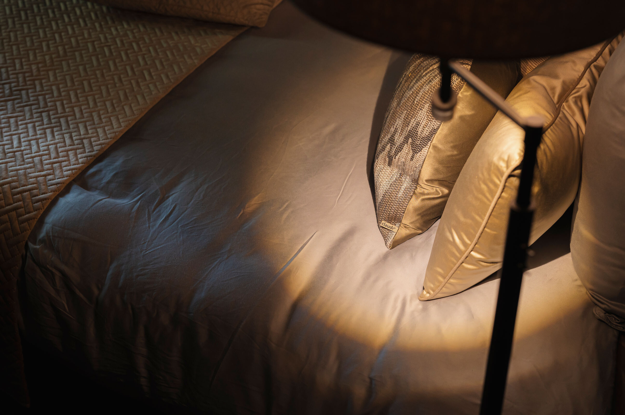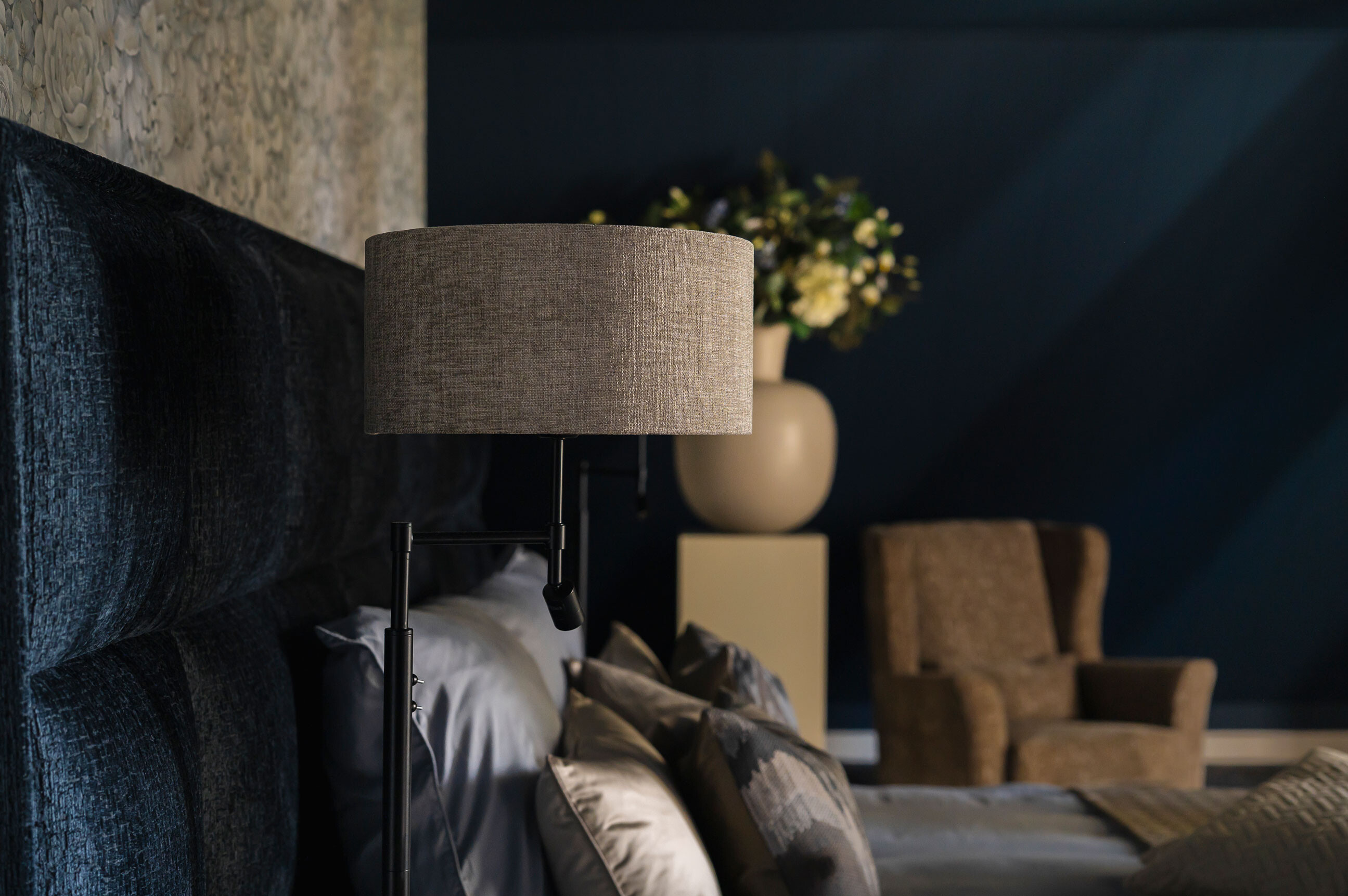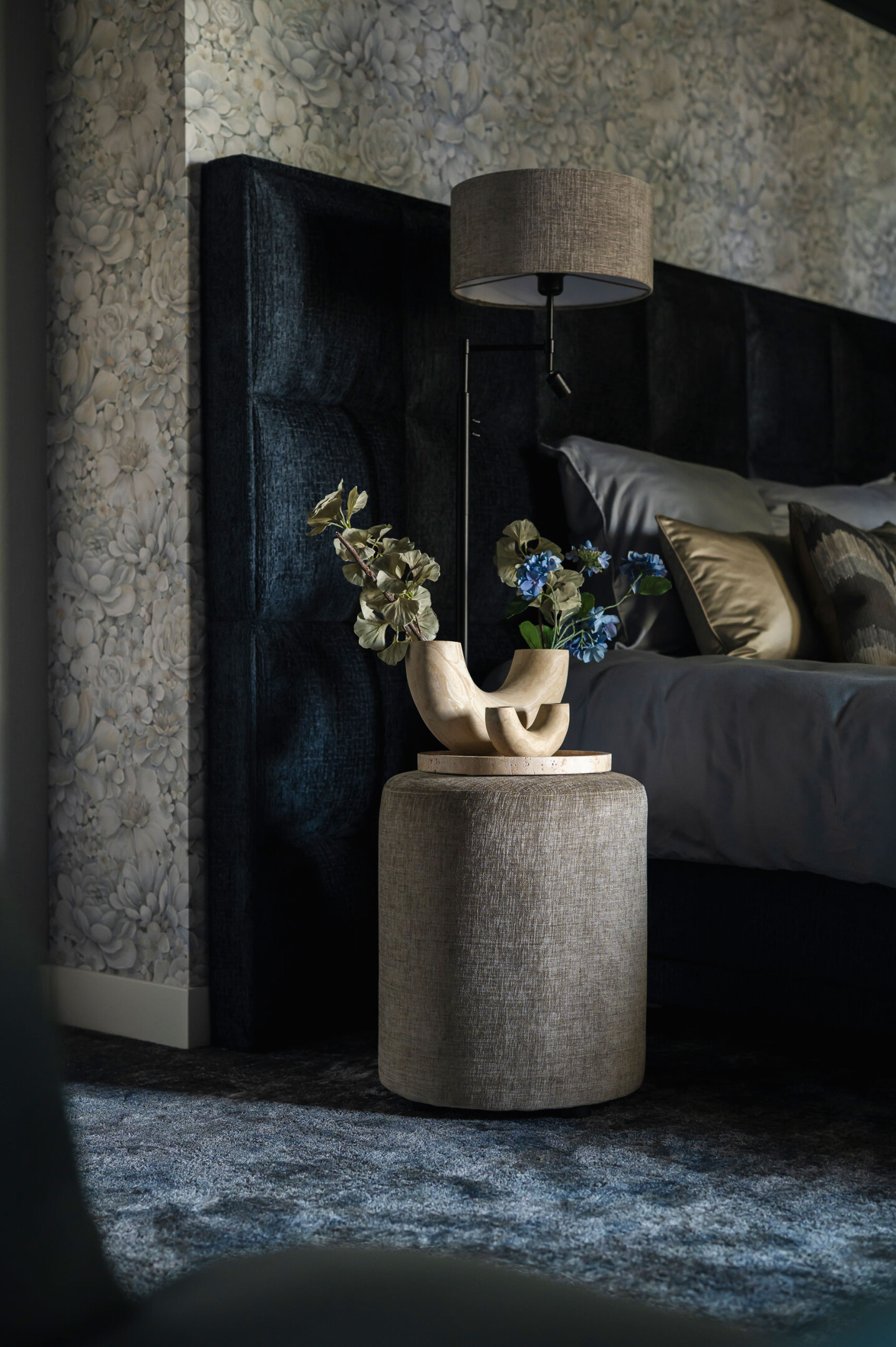 Het begint met het kiezen van het bed: een maatwerk boxspring met een uniek hoofdbord dat meteen de toon zet voor de rest van de ruimte. Vanuit die basis stemmen we kleuren en materialen op elkaar af. Daarna volgt het tapijt, waarover de meningen in het begin uiteenlopen. Mevrouw denkt aan effen, meneer aan bewerkt. Door de varianten naast elkaar te leggen en het geheel te bekijken, ziet ook mevrouw hoe een subtiel patroon juist rust én diepte geeft aan de grote ruimte.
